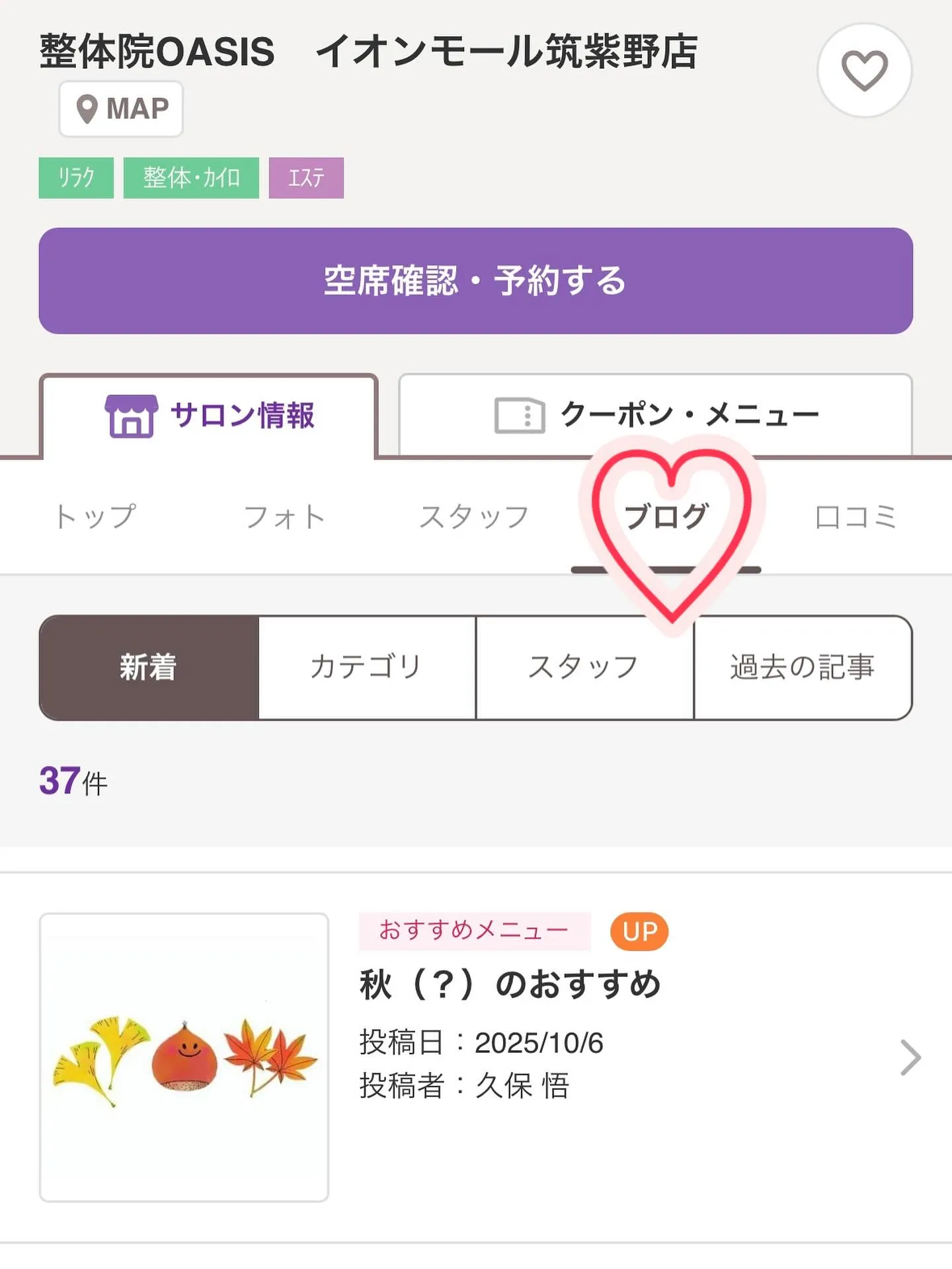 こんにちは!整体院オアシス筑紫野院です!最近は涼しい時間も増えて、過ごしやすくなりましたね🍂さて、整体院オアシスではホットペッパーの【ブログ】も更新しています✨今回は久保先生が執筆!久保先生…